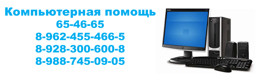 Наш сервис по ремонту компьютеров оказывает оперативные профессиональные услуги компьютерной помощи частным лицам и компаниям. Наши специалисты по ремонту компьютеров обеспечивают оперативное восстановление работоспособности ПК, а мастера компьютерной помощи помогают вам наслаждаться нормальной работоспособностью техники. Выезд специалиста к вам на дом для проведения ремонта компьютера или оказания компьютерной помощи бесплатен, также бесплатно мы предоставляем услугу тестирования ПК или ноутбука, если впоследствии вы не отказываетесь от услуги ремонта компьютера или компьютерной помощи. Выбор за вами: 8-962-455-466-5 ,8-928-300-600-8 или 8-988-745-09-05.